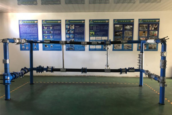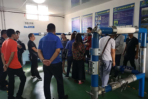 水司領(lǐng)導(dǎo)參觀樣品展示架,對于大連鑄鴻機(jī)械的產(chǎn)品能達(dá)到不同管材,不同外徑無縫對接的優(yōu)良性能為之贊嘆。