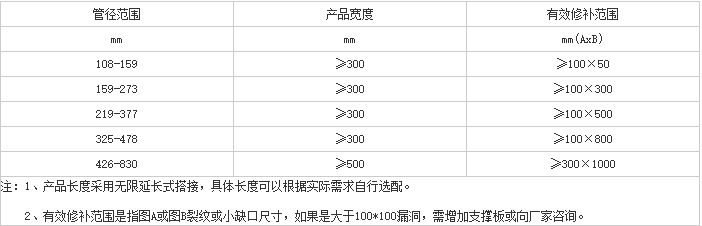 通過多方面用戶反饋發(fā)現(xiàn),90%以上的直管段泄漏屬于單側(cè)泄漏,由于使用單位各種材質(zhì)管道管徑大小參差不齊,造成每種管徑都需備庫,增加了用戶的庫存壓力。我公司新研發(fā)的廣泛范圍卡扣式修補(bǔ)器(專利號(hào):ZL 2015 2 1136082.9)。主要針對(duì)直管段單側(cè)泄漏的情況,采用卡帶式堵漏技術(shù),該產(chǎn)品適用范圍廣,減少用戶庫存壓力;靈活方便,安裝快捷;膠板采用無限延長型結(jié)構(gòu),突破了修補(bǔ)長度限制,給用戶帶來了非常便捷的堵漏條件。