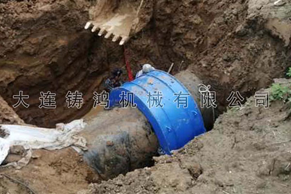 營口地區(qū)一地下承插排水管線泄漏,DN1200,一端鋼管,一端螺旋焊管,中間有1米6高度的法蘭盤。年久管道,螺旋焊管一端有變形,并且兩個管有錯位不同心。選擇承插口全包修補器,完成修復。
