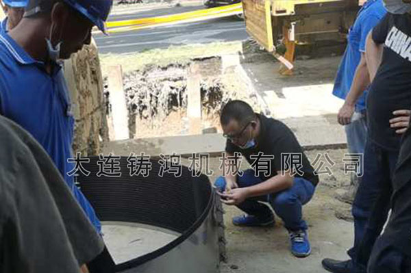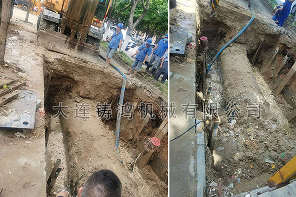 佛山市禪城區(qū)供水有限公司發(fā)現(xiàn)一處管道發(fā)生泄漏, 管道外徑1420mm,管道壓力4公斤左右,漏點(diǎn)10mm,管道材質(zhì)為鋼管,用鑄鴻無限延長修補(bǔ)器兩片長度500mm完美解決漏水問題。