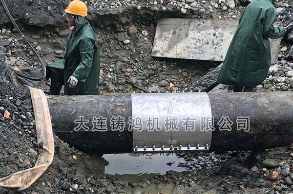 成都雙流區(qū)非標(biāo)鋼管發(fā)生泄露,管道外徑為628mm,漏點(diǎn)為二十公分縱向裂縫,管道有變形且表面凸凹不平,凸起高度約為2—3mm,使用我司620—640板式修補(bǔ)器800mm快速搶修,得到水司領(lǐng)導(dǎo)高度認(rèn)可。