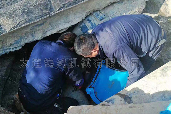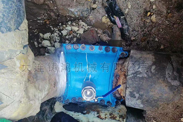 大石橋熱力公司DN250球墨鑄鐵管彎頭處底部發(fā)生泄露,面有腐蝕,工況緊急,現(xiàn)場不能停水,現(xiàn)場施工作業(yè)面積狹窄,管道和管道之間距離離得比較近,因為正值供暖期,所以使用鑄鴻全包彎頭修補器快速修補該處漏點。
