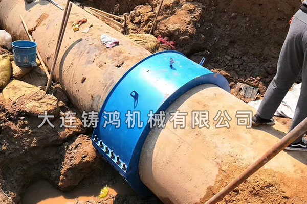 徐州粵海水務(wù)DN1200鋼管承口,水泥插口異性材質(zhì)承插口處泄漏,空間狹小,選用鑄鴻全包型承插口修補(bǔ)器進(jìn)行修復(fù)。經(jīng)過現(xiàn)場(chǎng)工作人員的努力,僅用1.5小時(shí)完成修復(fù)。