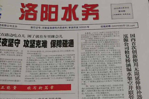 洛陽橋涵426球鐵架空管道泄露,裂縫從承插口斜面喇叭口位置一直到直管段,裂縫長(zhǎng)達(dá)3.2米并有空間限制,采用無限延長(zhǎng)修補(bǔ)器2個(gè)1米長(zhǎng),1個(gè)1.2米,1個(gè)承插口修補(bǔ)器,產(chǎn)品總長(zhǎng)度3.6米,將承插口修補(bǔ)器一邊卡在插口管道,另一邊卡在承口這邊的修補(bǔ)器上,產(chǎn)品安裝靈活,操作方便,現(xiàn)已通水,搶修非常成功,由于工況特殊各級(jí)領(lǐng)導(dǎo)都非常關(guān)注,此工況得到水司領(lǐng)導(dǎo)的一致好評(píng)!并在洛陽水務(wù)報(bào)刊登報(bào)道,洛陽領(lǐng)導(dǎo)已將此工況上報(bào)中國(guó)水務(wù)報(bào)。