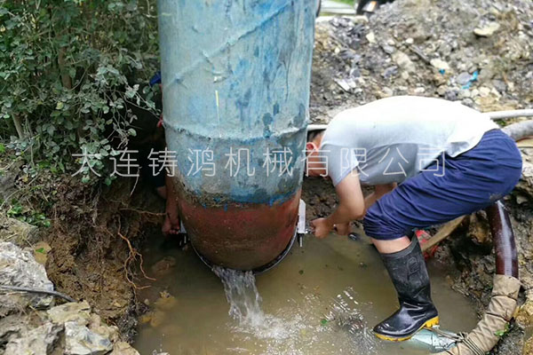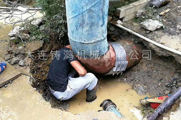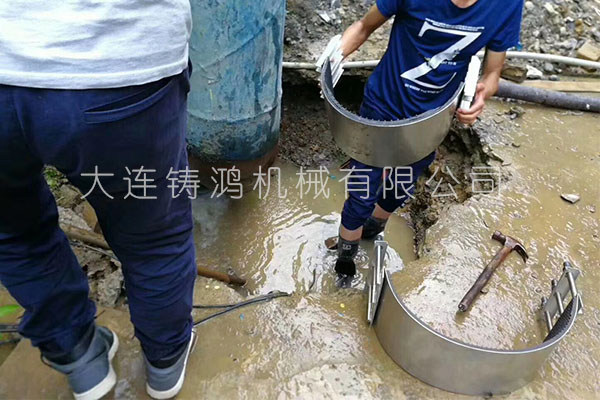 現(xiàn)場(chǎng)工況:貴州都勻水務(wù)某管段發(fā)生泄漏,經(jīng)過(guò)現(xiàn)場(chǎng)工作人員排查,鎖定一鑄鐵彎頭處,管徑DN400,管道帶有輕微變形,現(xiàn)場(chǎng)操作空間狹小,水從漏點(diǎn)處噴出,壓力較大,使用鑄鴻彎頭修補(bǔ)器帶壓進(jìn)行修復(fù)。
