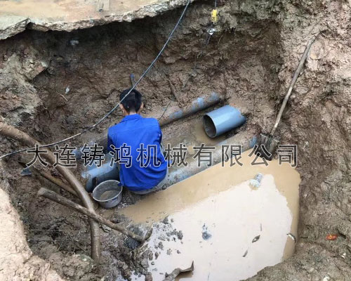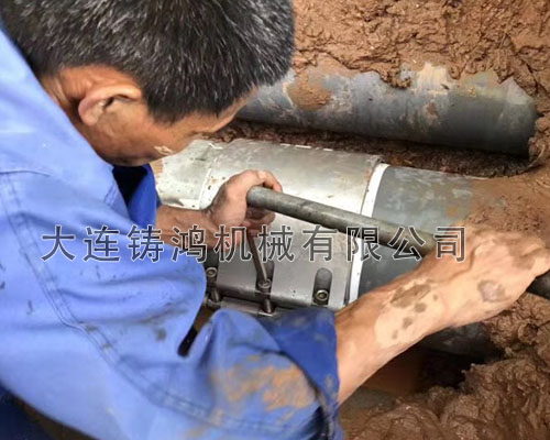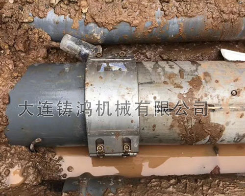 廣東佛山施工現(xiàn)場非標(biāo)280管中間發(fā)生斷裂,由于漏點較大,修復(fù)起來較為困難,施工人員決定切斷破損管處采用一段新管進(jìn)行連接,由于備貨庫存里沒有相同的管材,于是用了一段鋼管,使用“鑄鴻”雙卡管道連接器進(jìn)行快速連接。
